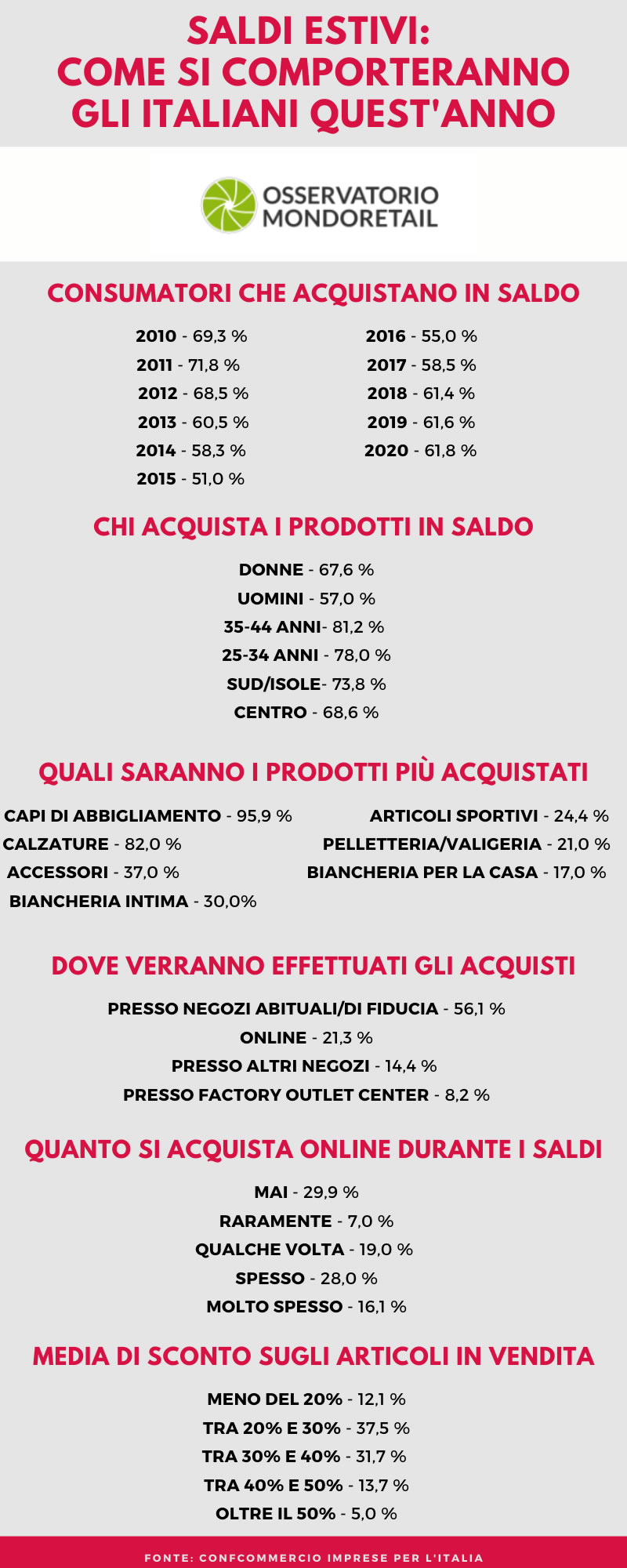 Questi, in sintesi, i risultati principali dell’indagine sugli acquisti degli italiani in occasione della stagione dei saldi estivi realizzata da Confcommercio Imprese per l’Italia, che ora andiamo ad analizzare più nel dettaglio.