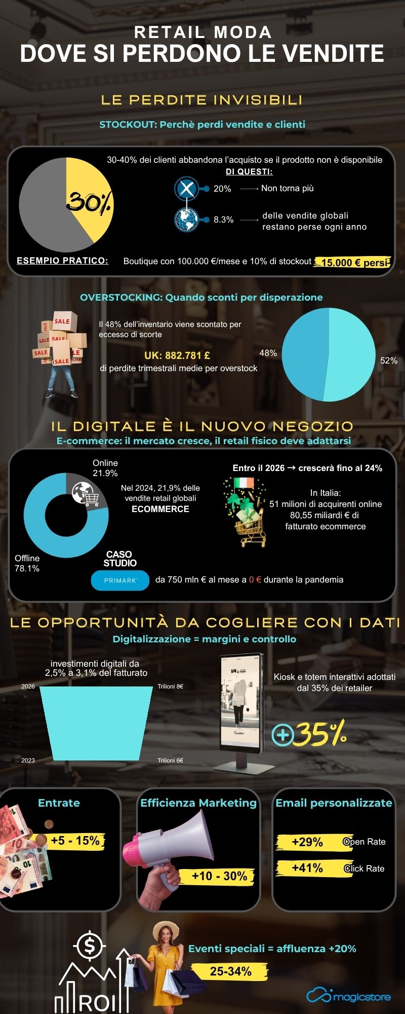 In base a questi numeri è evidente che un’azienda retail, con una scarsa presenza online, rischia di perdere una fetta sempre più grande di mercato, poiché i consumatori si spostano verso piattaforme digitali per comodità, prezzi competitivi e ampia scelta. Secondo un’analisi di Sales Layer l’assenza di un modello di e-commerce ha portato Primark a passare da vendite mensili di 750 milioni di euro a zero durante la pandemia, evidenziando come la mancanza di canali digitali possa azzerare le entrate in situazioni critiche.