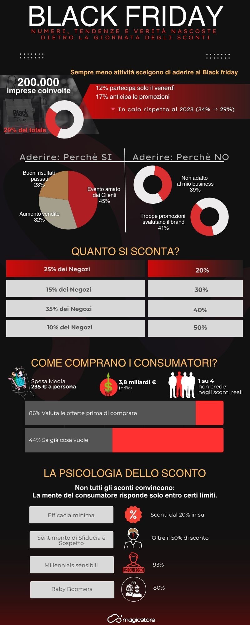Come rivelato da un doppio sondaggio di Confesercenti risalente all’anno scorso, il primo condotto sulle imprese associate e il secondo realizzato con IPSOS su un campione di consumatori, emergono dati piuttosto contrastanti. Benché il Black Friday sia nato come evento online, secondo il sondaggio nel 2024 hanno partecipato oltre 200.000 imprese del commercio di vicinato (il 29% del totale), poco meno di un negozio su tre. Il 12% ha partecipato solo il venerdì del weekend del Black Friday, mentre il 17% ha anticipato le promozioni. La percentuale è in calo rispetto al 2023, quando la quota dei negozi di vicinato che ha partecipato si è attestata al 34%.